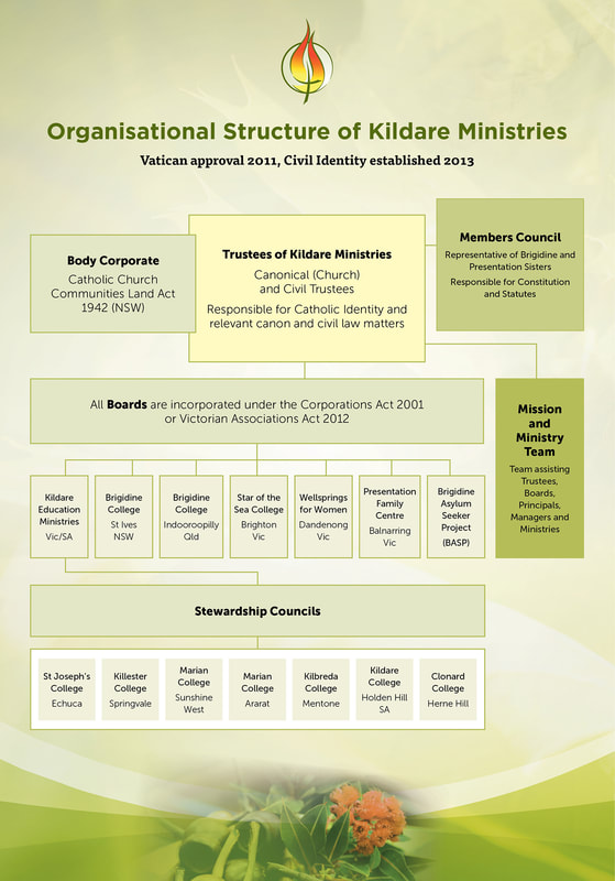 The Trustees of Kildare Ministries hold civil and canonical responsibilities as the Catholic Church authority for ten schools and three community works previously the responsibility of the Brigidine Sisters Australia and the Presentation Sisters Victoria. The Trustees are entrusted with the heritage, traditions and the charisms of the Brigidine and Presentation Sisters and seek to ensure that these are stewarded purposefully and meaningfully into the future. Kildare Ministries seeks to develop this contemporary narrative.